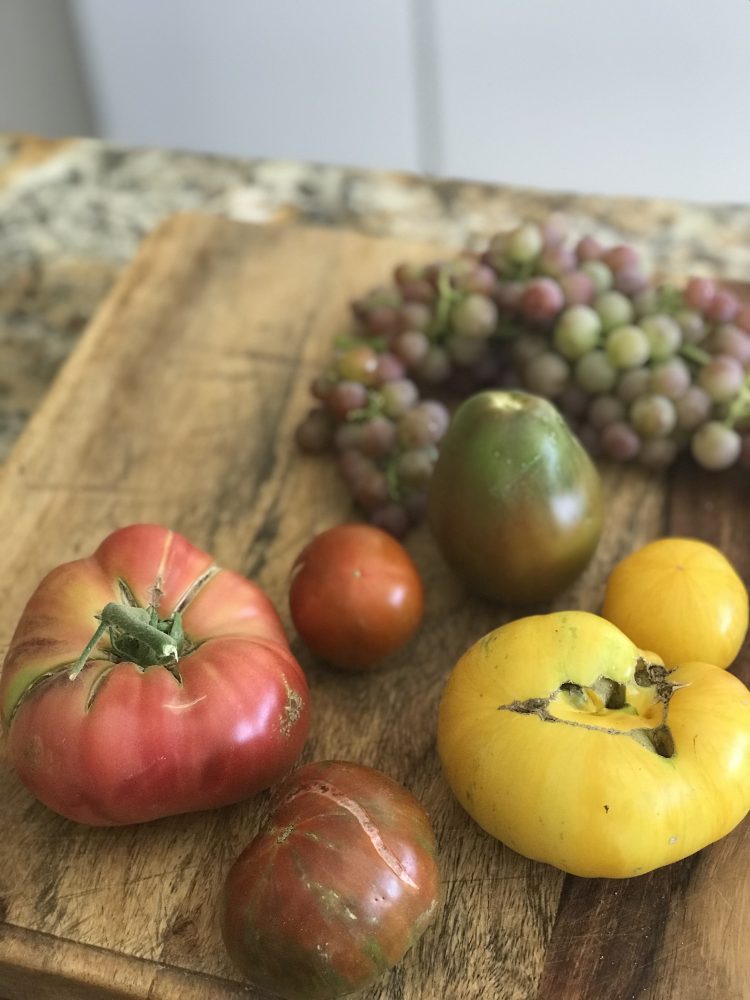While we were out staking our giant heirloom tomato plants , we found a few buried in the middle of the plants. These are pork chop (yellow), Japanese black trifle (pear shaped)Japanese black prince, and blue beauty, as well as large bared boar. We buy most of our seeds from seed savors or baker...