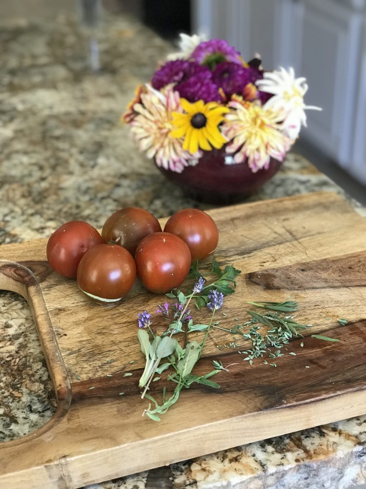 We still are getting only Japanese black prince tomatoes, we will be making some bruschetta and herbed roasted chicken....