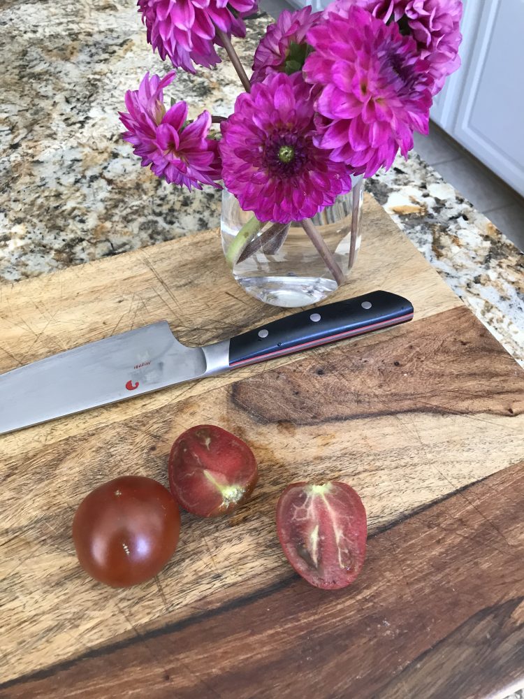We harvested this years first tomatoes, and boy this is a gem Japanese black prince a rich flavorful true tomato. I wish everybody had the opertunity to eat real farm tomatoes it makes me never want to eat any other tomatoes again....