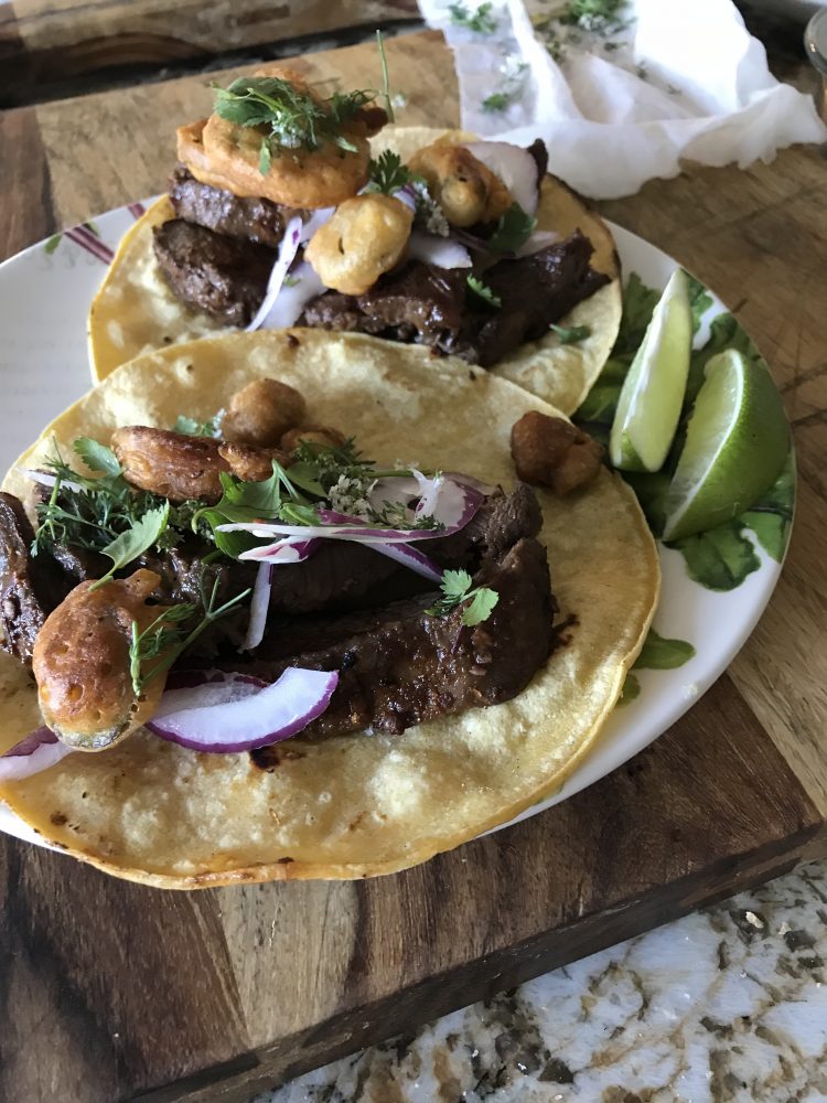 Wow is what we say funny I could try and be a great chef and all I have to say is my family is from the south and I love love fried food so I Fried the peppers to top off the flat iron steak anlong with our farm fresh herbs and tacos such flavor and extra crunch and flavor we love street tacos....