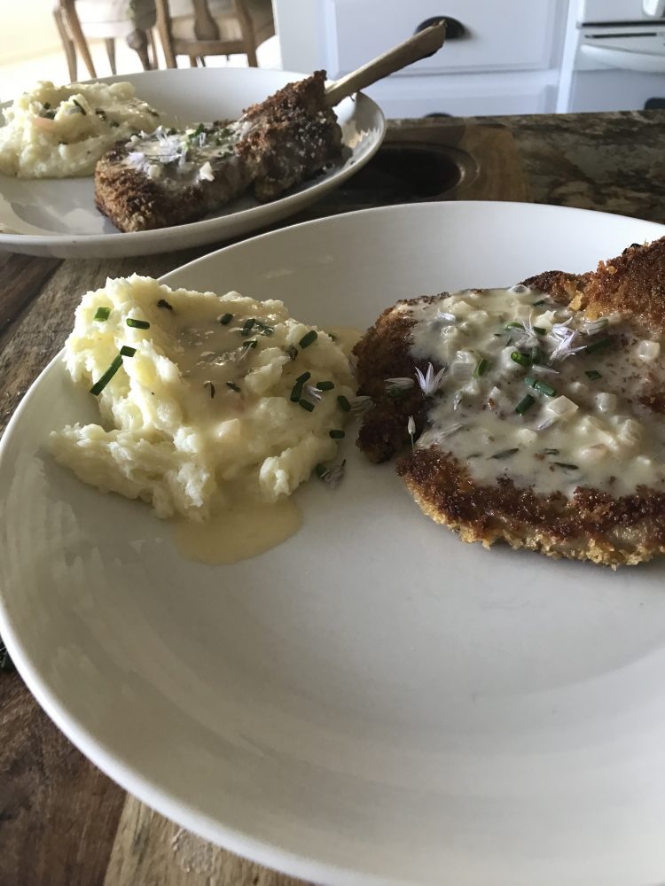 The veal “a la anglaise “ veal breaded was fantastic with the mashed potatoes with thyme butter sauce it was so rich and flavorful we each ate about four bites each of potatoes and veal. We frenched our chop bones and wow they were great....