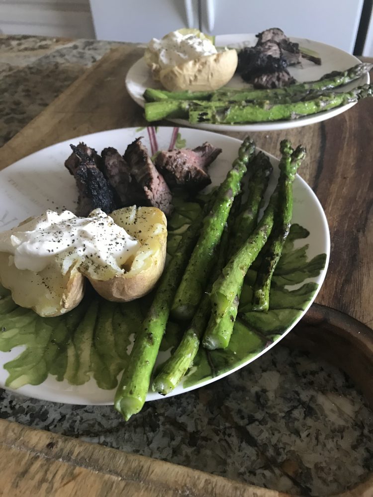 We ordered in some wague meat and tonight we chose rogue tri tip with organic grilled asparagus and organic baked potatoe we spiced and coffee rubbed the meat and it was a perfect meal....