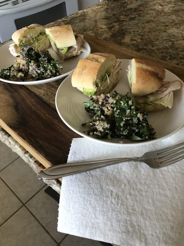 We had our left over chopped kale salad with our farm radish, beets, carrots , and peas along with a Black Forest turkey avocado sandwich using o happy bread fresh french bread ....