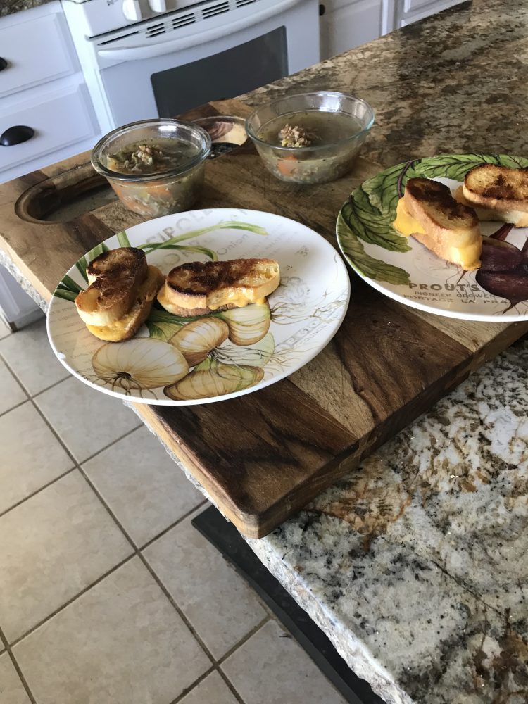 We had our turkey drum stick soup and we made it with our hiertage Spanish black turkeys and their legs are really tough as they fly into trees and run free on the farm and the meat is dark mahogany color we slow cooked the soup for hours add some faro grain and then made petite grilled cheese...