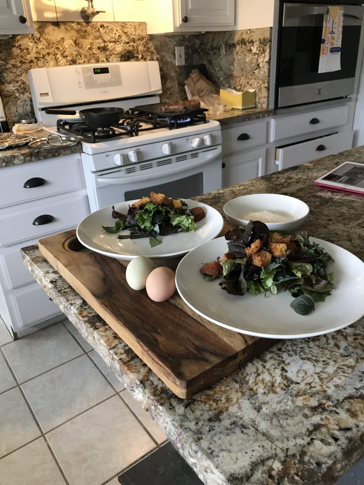 Steak salad using our farm fresh greens along with frico eggs in Parmesan cheese bed....