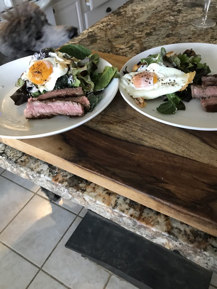 Man oh man this my kinda meal and it’s funny both of us ate the steak last and in fact gave our dogs most. When you can eat farm fresh food there is nothing like it from our organic free range pastured eggs were the star and then comes the farm fresh greens add the french o happy bread bakery bread...