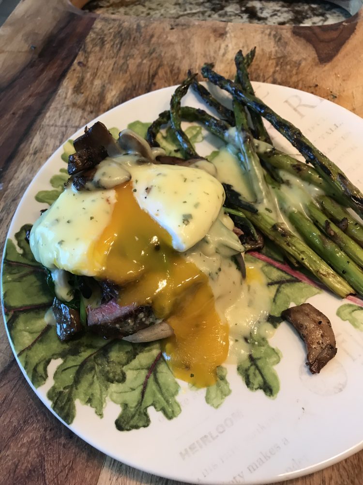 We used our wayguy beef with our farm grown stir fry mix topped with a farm fresh pastured egg and barnaise sauce with the asparagus and mushroom left overs....