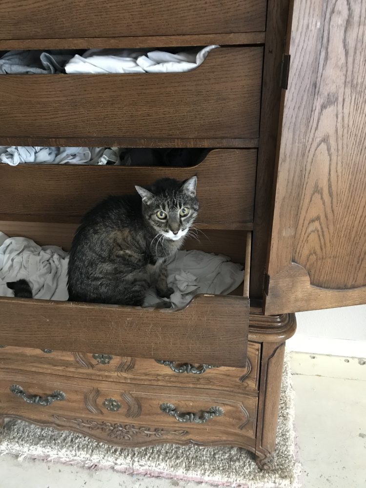 This crazy old lady is 19 years old and she used to demand to be in a drawer in our amour all the scratches are old and I swear Shimi is going back word in age she will set a world record in cat years ....