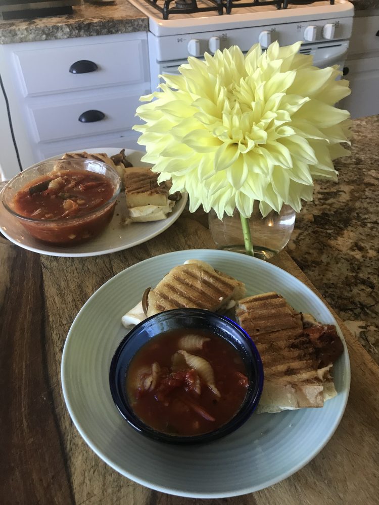 We had some of our farm fresh canned heirloom tomato vegetable soup along with some fresh capris panini using our local fresh French bread and our supper fragrant basil....