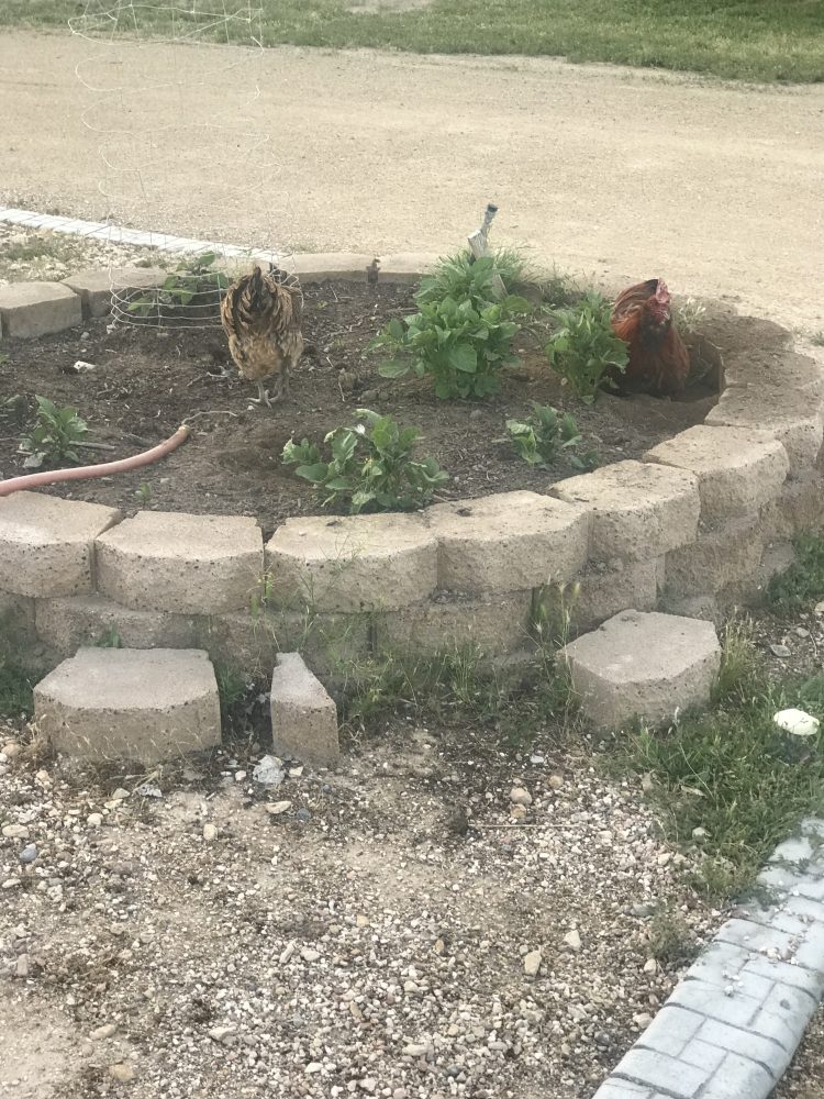 We have our sweet potato oakanawa purple and our Adirondack red and blue potatoes along with my farm favorite dahlias and Mr. rooster and gal are having a hay day kicking and scathing our gardens .