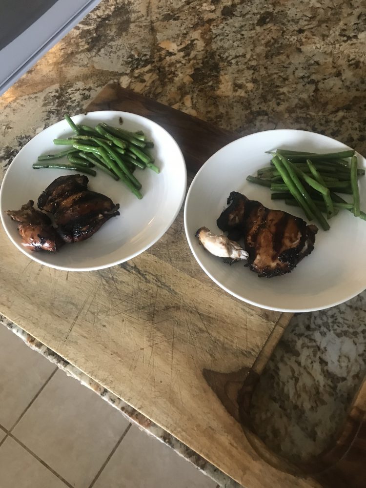 Well we were supposed to have tri tip and farm made potato salad but we got caught up in farm chores so what does a farmer do resort to pantry, freezer , and frig here we go french green beans with shallots and wine vinegar and chicken thigh .