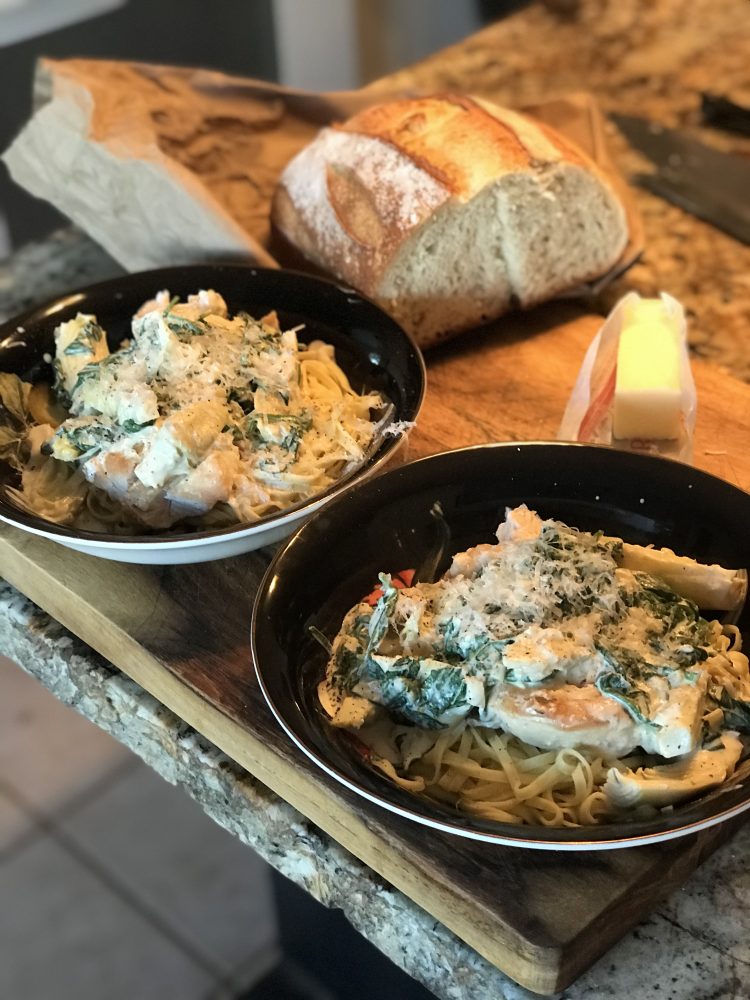 We had creamy spinach artichoke chicken and pasta along with our local o happy bread fresh bread. It was sooo good....