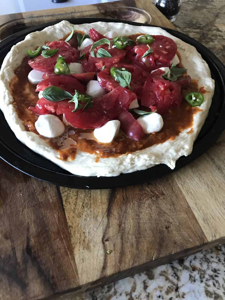 We made margarita pizza using our farm fresh heirloom marinara and our farm fresh basil, jalapeños, with our farm fresh heirloom tomatoes. We have never been to Italy but we suspect this is real Italian pizza....