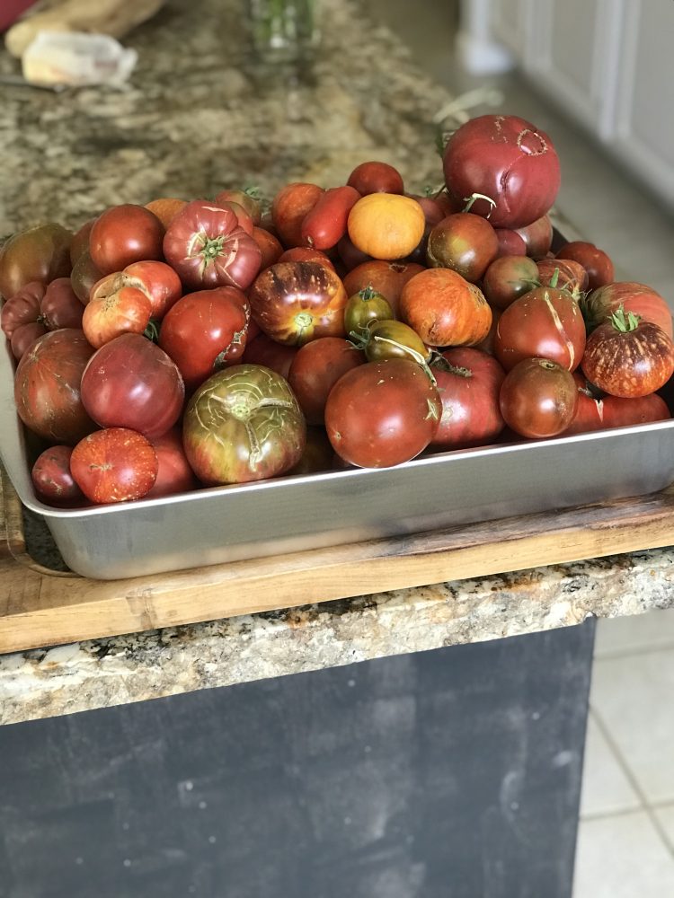 We are making slow- Roasted heirloom tomato and garlic Mariana sauce. The recipe calls for 23 pounds and that exactly what we harvested today. We have a fun day on the farm tomarrow as we will slow roast our garlic , and heirloom tomatoes for five hours before we can them....