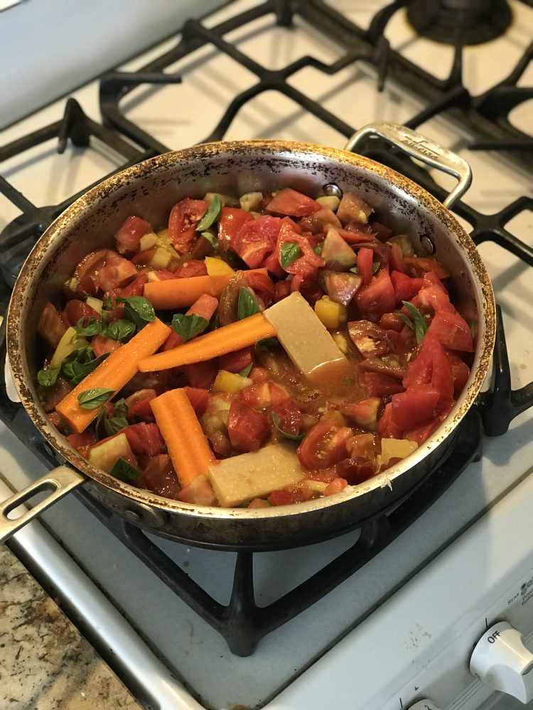 This recipe calls for parmigiano reggiano cheese rinds along with a carrot for sweetness ? With our hierloom tomatoes not sure we need more sweetness. We will pull the carrots after it’s finished simmering . We also used our farm fresh garlic and basil....