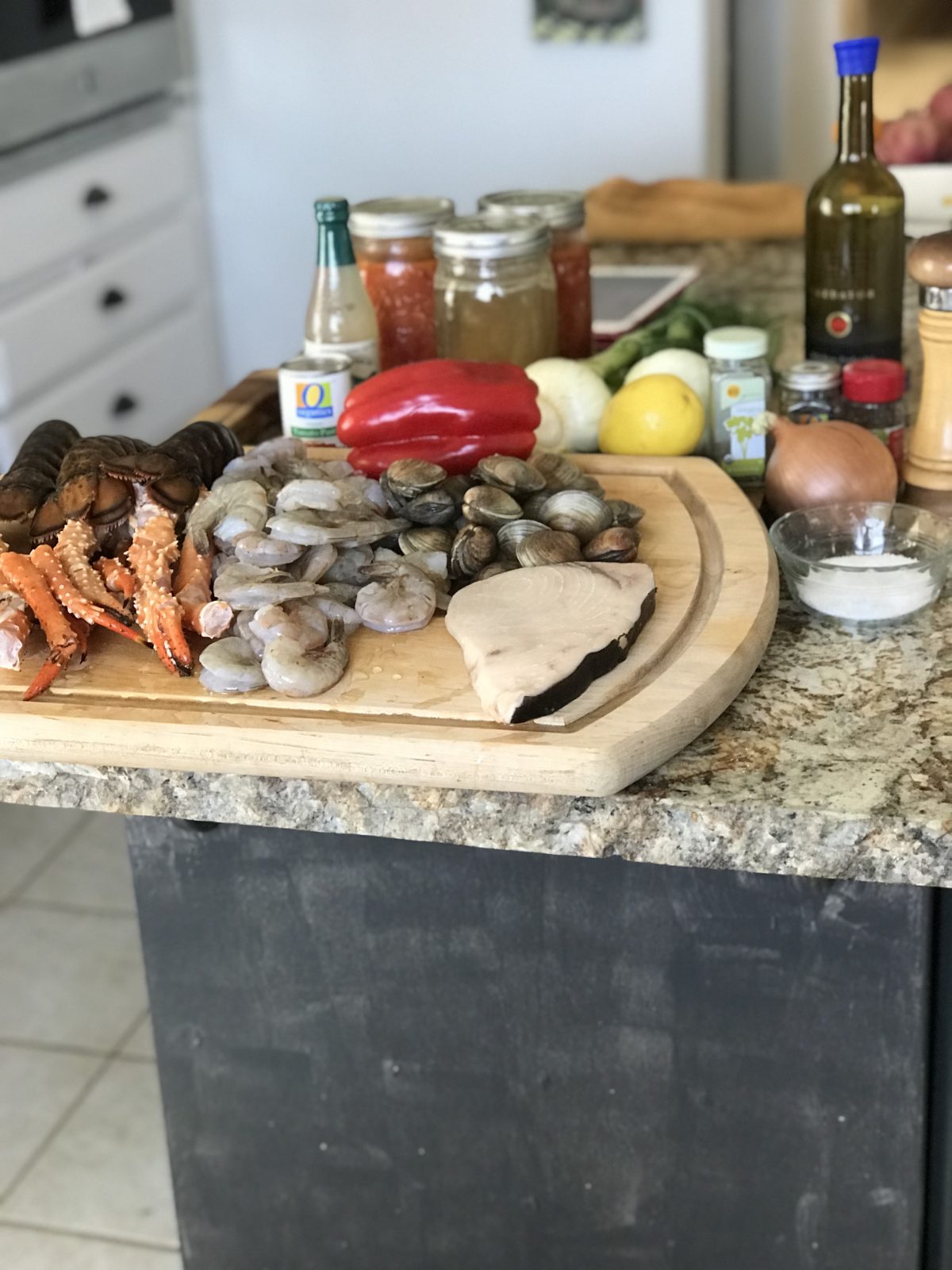 We are using Guy Fieri NorCal Cioppino recipe for the base , but used our hierloom farm made tomato sauce , used our chicken foot stock instead of water and used Alaskan king crap instead of Dungeness crab , a little less white fish and added lobster more to my liking.